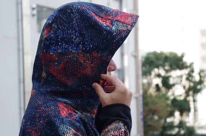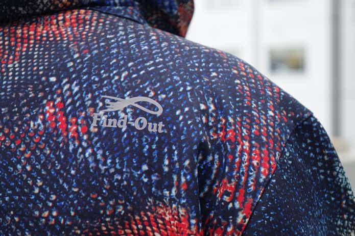 バックにはファインドアウトのロゴが。夜間の着用も安心の反射プリント仕様。