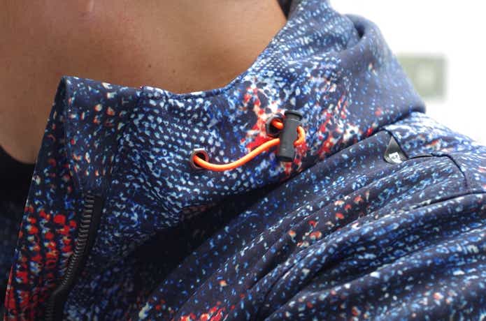 長めのフードにドローコードもついて、風やしぶきにも安心です。※完全防水ではありません。