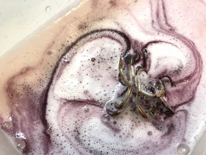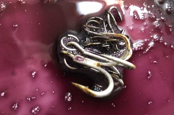 濃度の高いグレープジュースのような色に変わったところで、フックを取り出し水洗いを行います。
