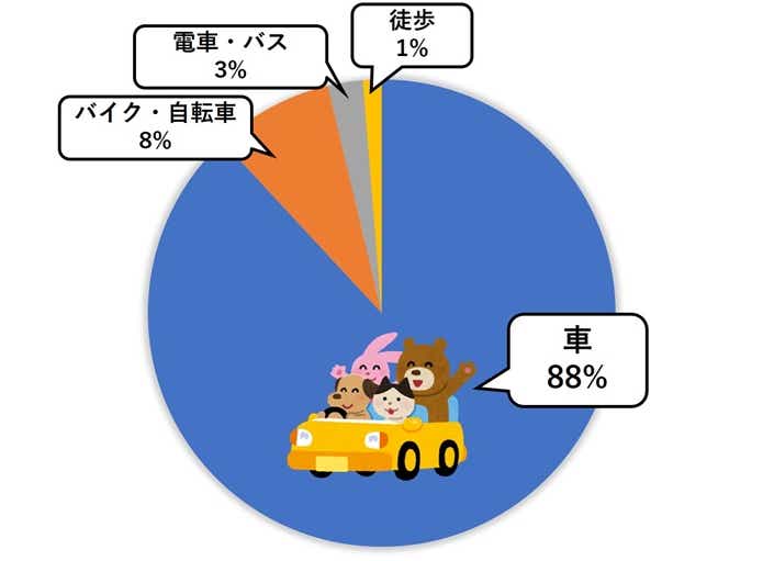 2位のバイク・自転車に大差をつけ、自動車が1位を独走。公共の乗り物である電車やバスでの移動も、非常に少ないことが分かります。