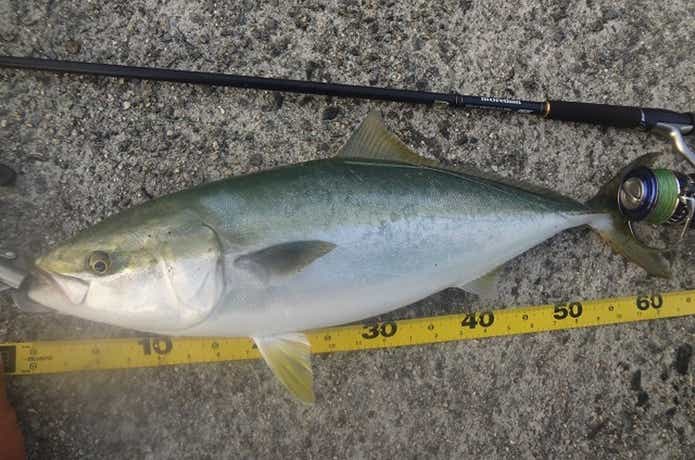 通常はシルバー系のロングジグを使いますが、フラッシュJサーベルであれば、ロングジグではスレてしまった青物を仕留めることができます。