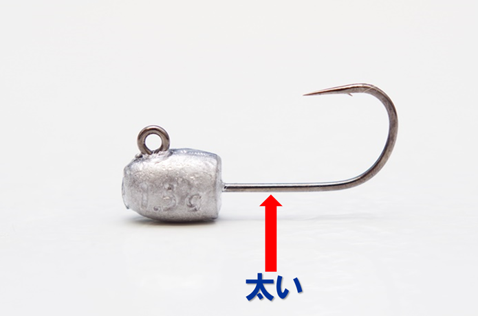 貫通力は細軸に劣りますが、強い負荷が掛かっても伸びにくく、大型狙いに活躍します。しっかりと針を貫通させるには、タックルのパワーと力強いフッキングが必要。