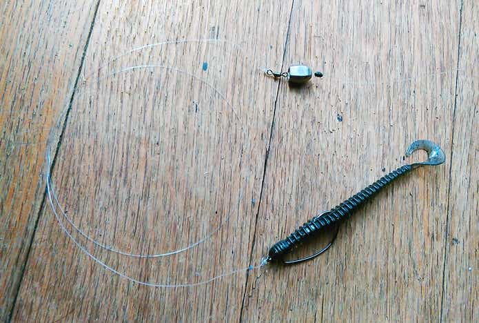 ボトムを中心としたアプローチが基本となるスーパースティックカーリーのもっとも定番の使い方。通常のカーリーテールワームに比べるとサイズ感が大きく、自重があるためシンカーには10グラム以下のやや軽めのウエイトを選びましょう。合わせるフックは推奨されている2/0フックはもちろん、吸い込みをよくするために#1から2サイズまでサイズを下げるセッティングおすすめです。