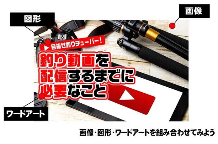 本記事のサムネイルを例に挙げていますが、Excelの機能である『図形』『ワードアート』そして『画像』の3つを組み合わせ、シンプルな作りで仕上げることが可能です。