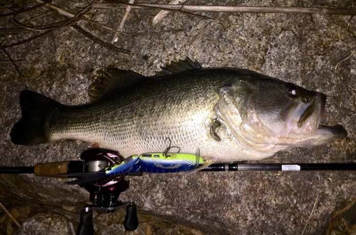 冒頭の魚の数時間後に釣れた59.5cmのバス。完全なサスペンドにすると躊躇なくルアーを本気食いしてくることもしばしば。