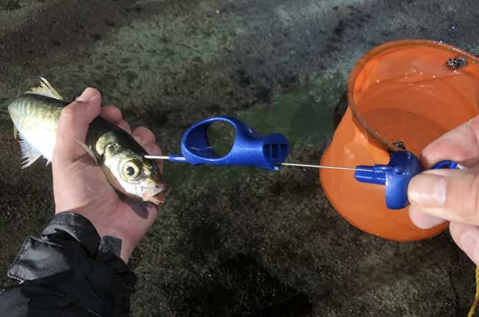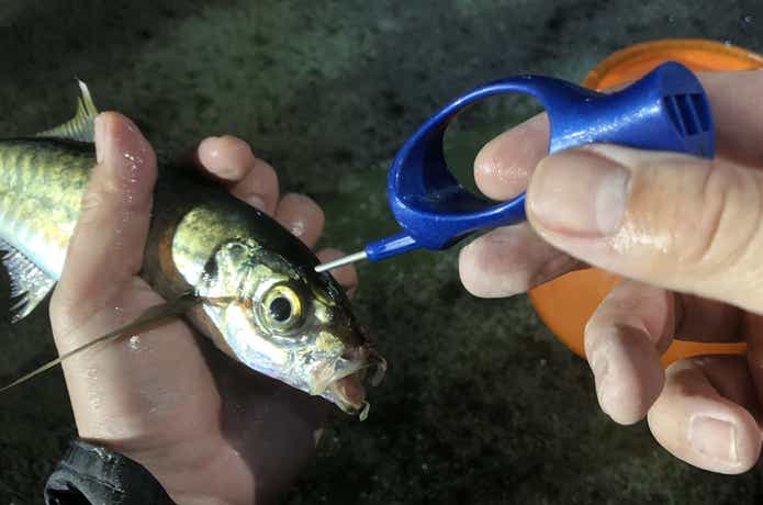 ニードルを眉間から側線部方向に差し込み、脳を締めて魚の動きを抑制。