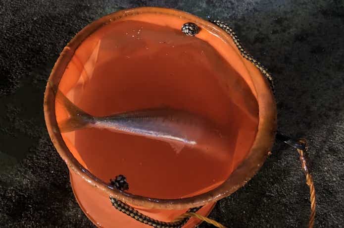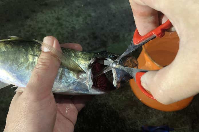 ナイフやハサミを使用してエラにある血管をカットし、血抜きを行いましょう。