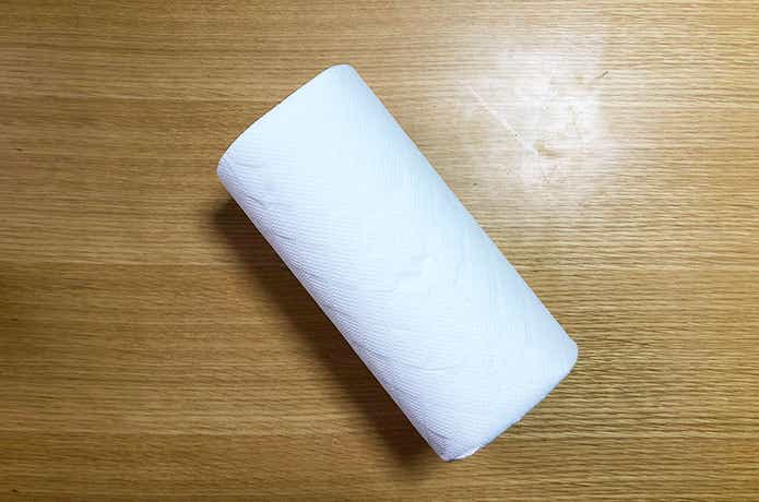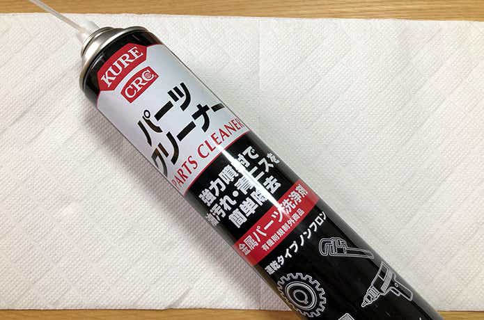 取り出したパーツにパーツクリーナーを吹きかけ、キッチンペーパーで拭き取ります。
