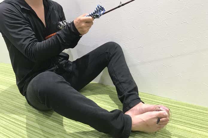 スプールにラインをしっかりと結びつけた後はいよいよラインの巻きつけです。ラインが巻かれているボビンに準備したペンを差し込み、必ず足でしっかり固定しながら巻きつけましょう。