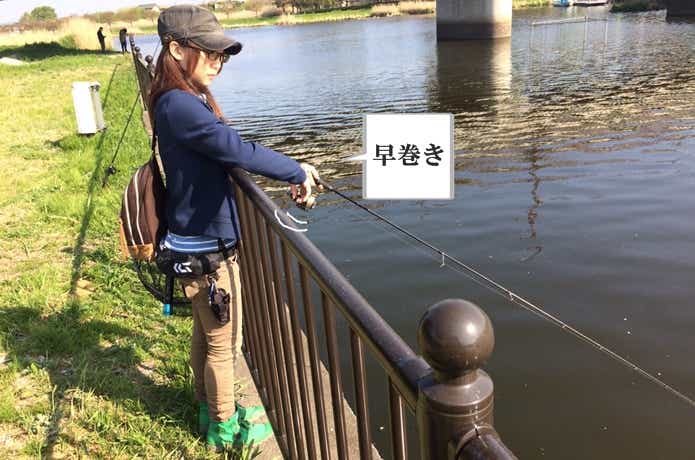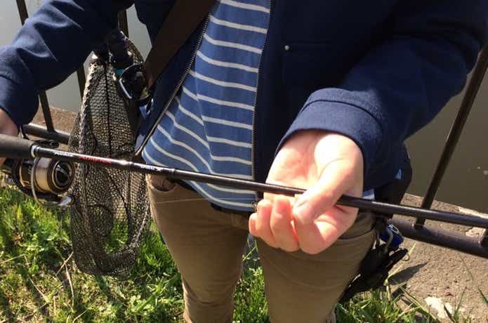 ルアーを水中に残したまま、片手はグリップ付近、もう片方の手はリールとバッドエンドガイドの間辺りを持ちます。