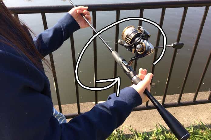 リールの重さを利用して、竿を回転させます。リールが外側から内側へ向けて回転する方向に回しましょう。
