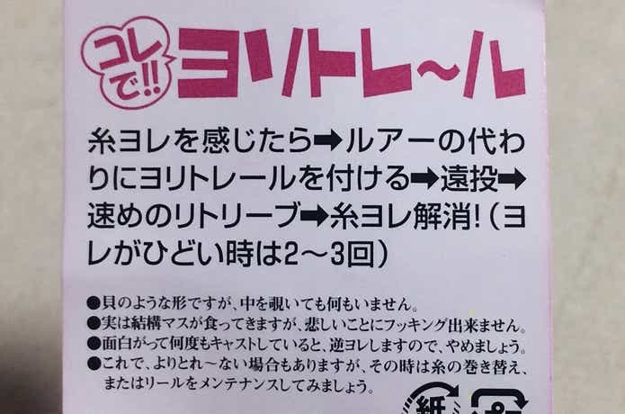 使い方や、ユーモアある注意書きがパッケージの裏面に記載されています。ルアーの代わりにラインにセットして遠投、早巻きで回収という簡単な方法でヨリが取れるようです。