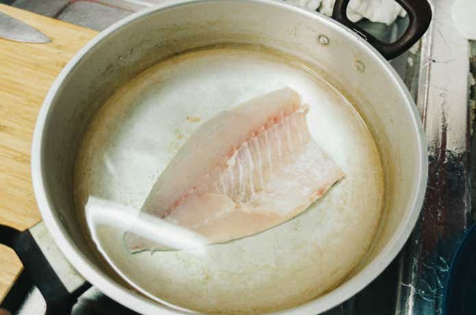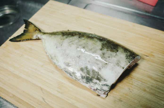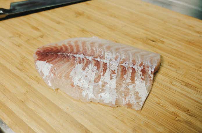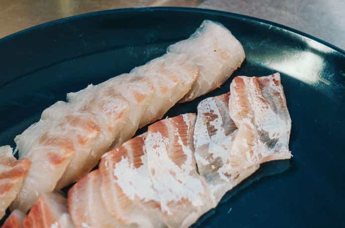 皮を剥いだ身の見た目はチヌにも似ており、脂のよく乗っている2月頃ほどではないですが、ほんのり脂も乗っています。