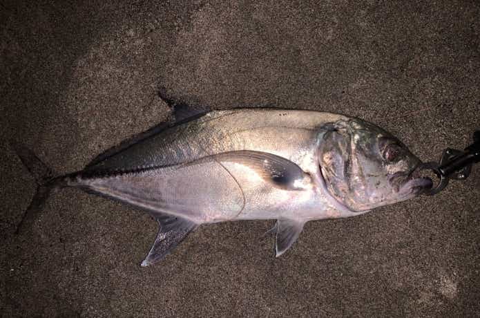 強烈な突っ込みと疲れを知らない抵抗の末、砂浜に横たわったのはまたしてもギンガメアジ。