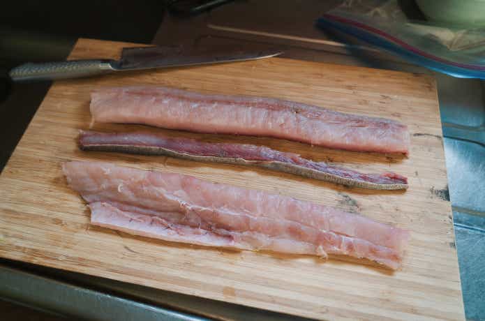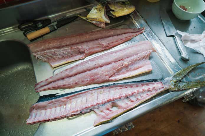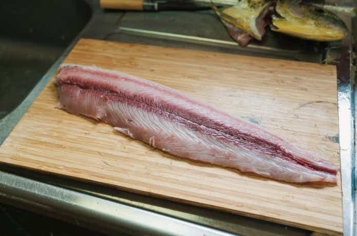 そして三枚おろしにします。通常の魚よりも中骨が盛り上がっているため、ガッツリと中骨まで包丁を入れておきましょう。