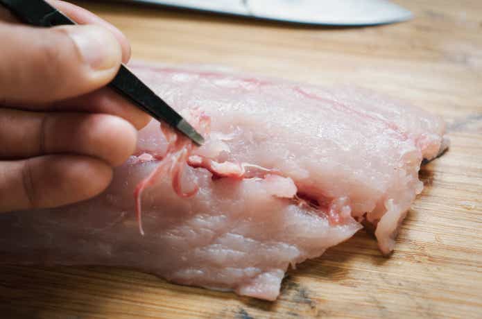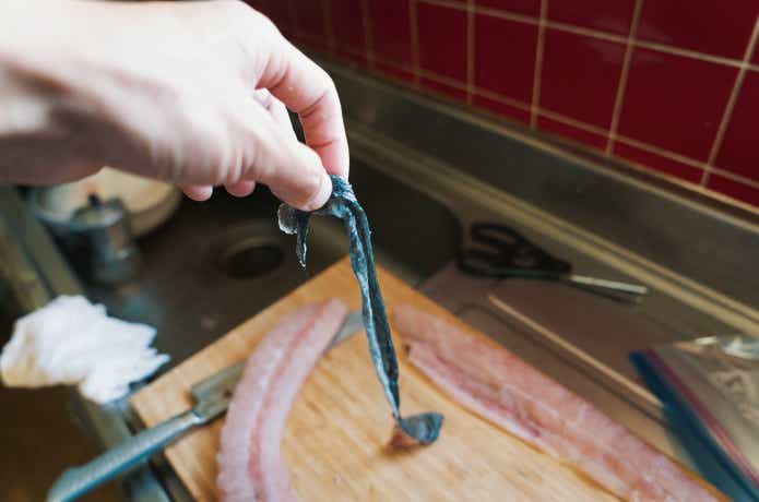 今回片身は火を通す料理、もう片身は刺身などでいただこうと考えているため、こちらの片身の血合いは切り取らずに中骨を抜くだけにしておきます。
