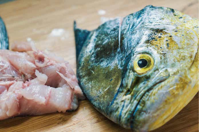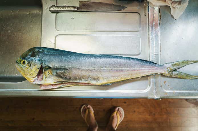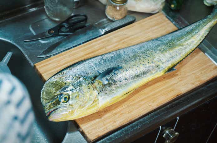 まずは下ごしらえ。シイラは体表面の粘液に毒をもっていたり、腸炎ビブリオ菌をもっていたりする可能性があります。