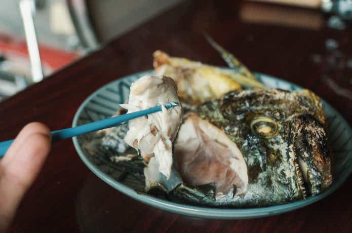 そして最後はカマと兜焼きです。シイラのおでこって気になりますよね、そこは食べられるのかと。