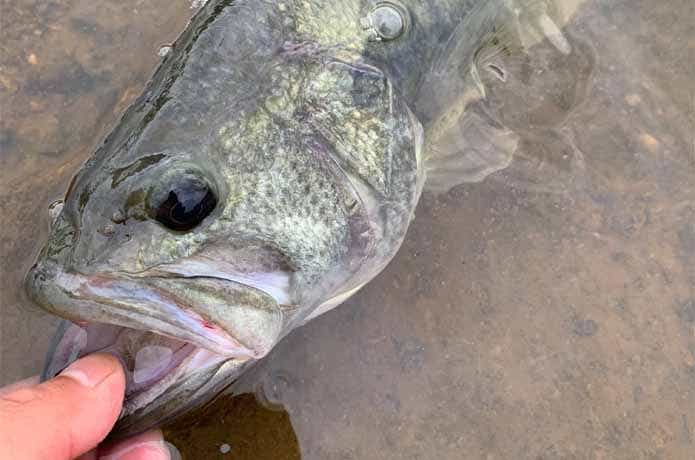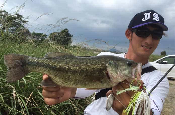 撮影のために近所のフィールドへ釣行してみると……。野池のオーバーハングにカーブフォールさせて小ぶりながらもキャッチ!