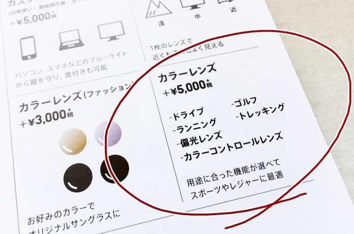 カラーレンズや偏光レンズを作る場合は、お好きなフレームの眼鏡を+5,000円で偏光レンズに変更することができます。ただし、非球面レンズではなく球面レンズになってしまうため、視力がかなり弱い人は歪みを感じやすいかもしれません。