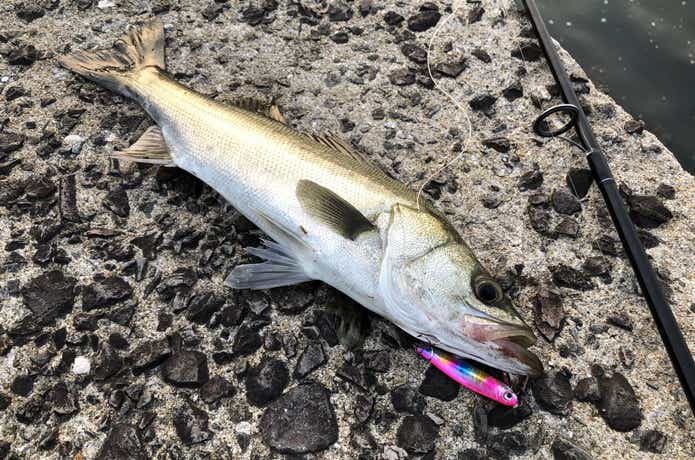 上がってきたのは元気なシーバス! 嬉しい1本です。