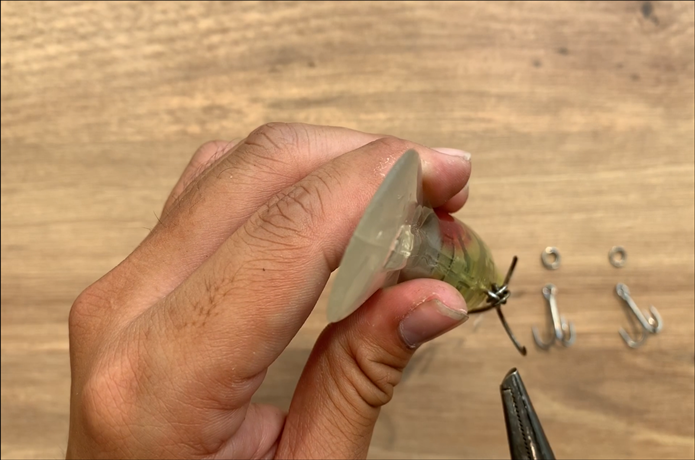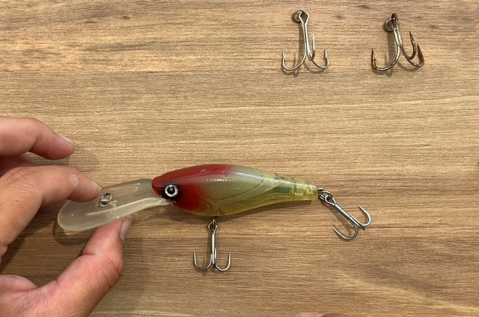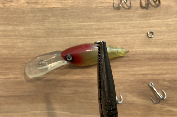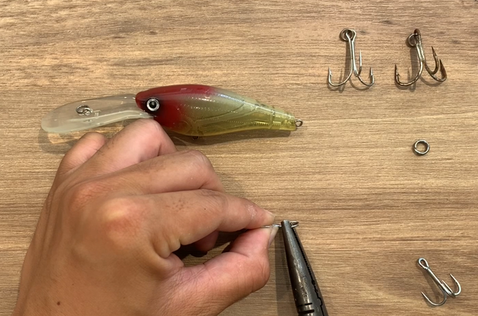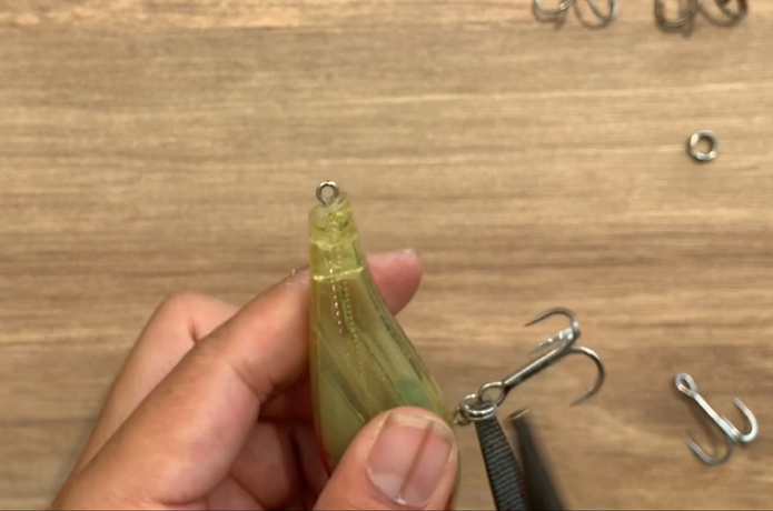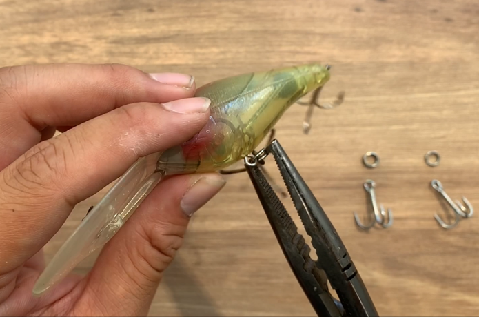 ルアーアイは細いので力も必要ありません。フロントフックが装着出来たら、リアも同じ要領でつけていきましょう。