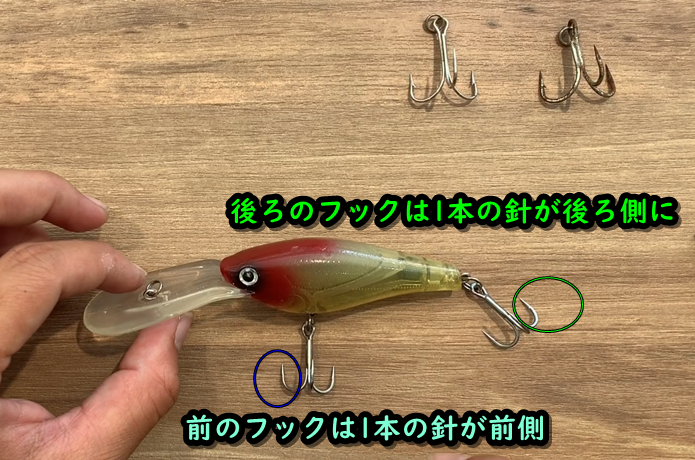 またメーカーもフックはこの向きで泳がせることを前提としているので、逆にルアーを付けると泳がなくなることもあります。フックの向きには注意しましょう。