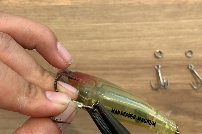 あとは簡単。スプリットリングにプライヤーを差し込み、広がったその隙間にルアーアイに挟み込みます。その後、グリグリ回していけばフックの取り付けが完了します。