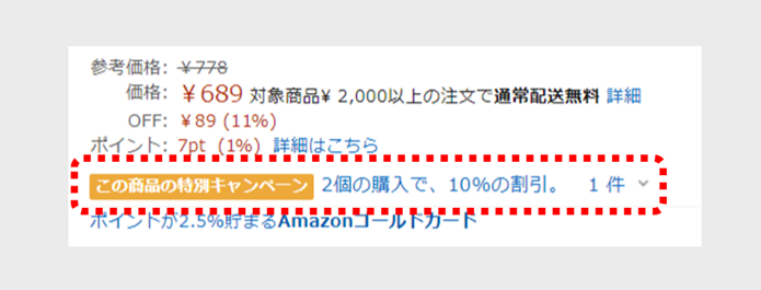 キャンペーンの対象商品を2点以上購入することで、合計金額から10%割引されます。アマゾンの商品ページにある「2個の購入で、10%の割引」と書かれた部分が目印です。