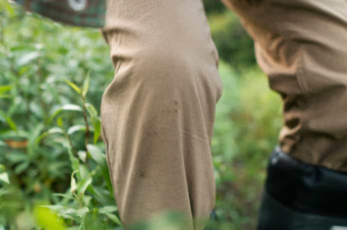 アウトドアを楽しんでいると膝を曲げるシーンも多いのですが、そんなときにも窮屈さを感じさせません。
