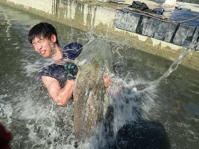 太さのある綺麗なオオナマズに思わず抱きついてしましました。