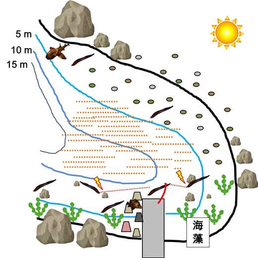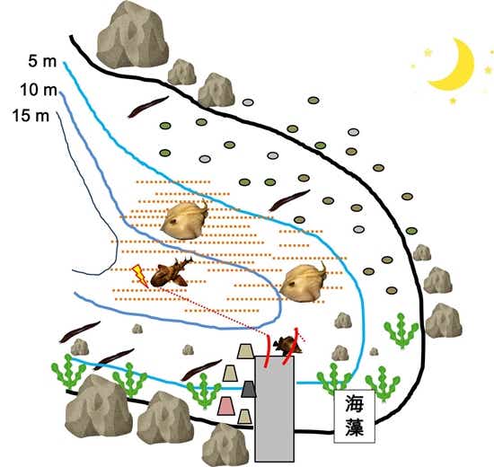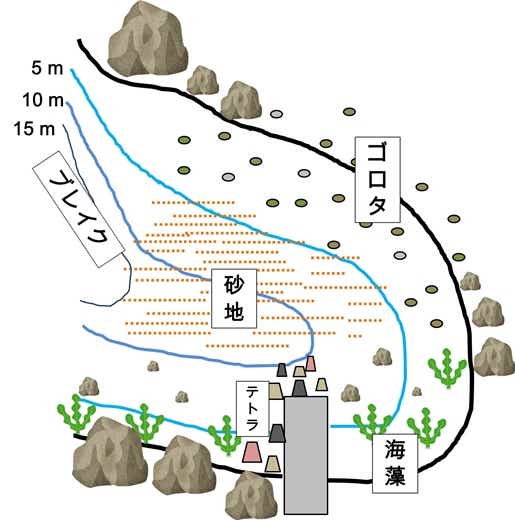 図鑑などでは、「ネコザメは岩礁帯を好む」という文面をよく目にします。しかし、岩礁帯は……。