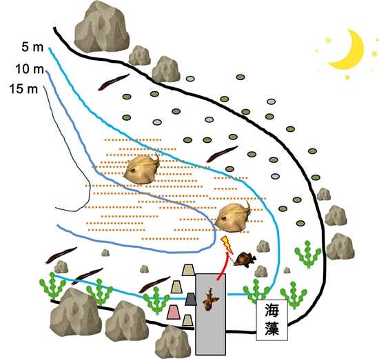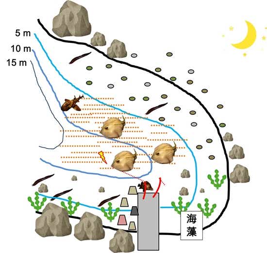 夜になればきっと色んな魚が来遊し、ウツボ以外の魚を狙い撃てるだろうと読んだ訳です。