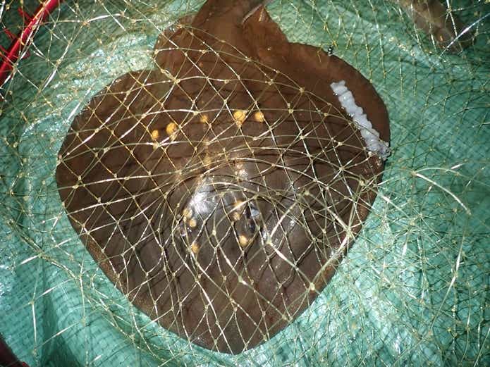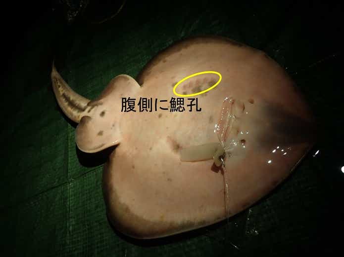 お腹側に鰓孔が5つあります。つまり、エイの仲間です!