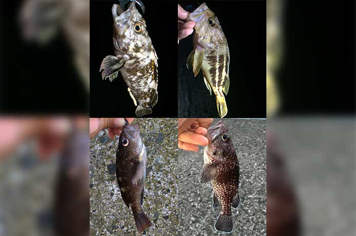 ロックフィッシュは北海道ではおなじみのエゾメバル(左下)以外にも、アイナメ、クロソイ、オオゴンムラソイ(左上)、シマゾイ(右上)、タヌキメバル(右下)などいろいろ釣れちゃいます。