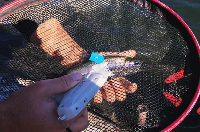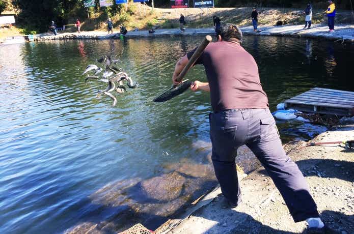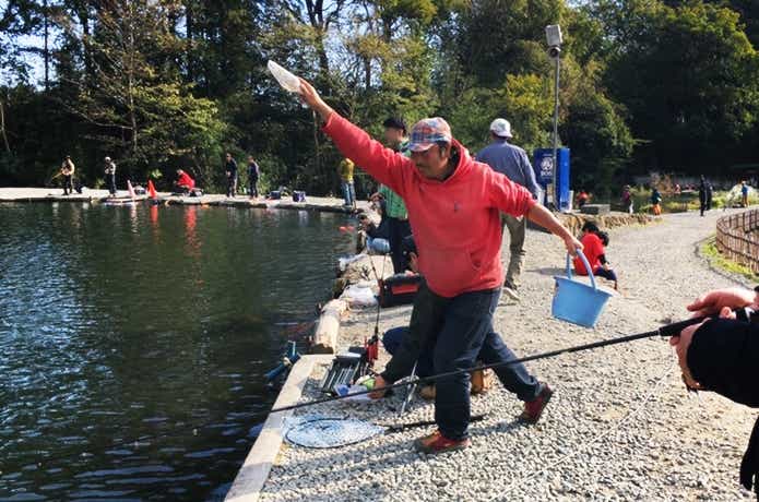 トラウトエリアには、青タグの付いたトラウトが30尾ほど放たれています。これは、『青タグハンター』というゲームイベント。