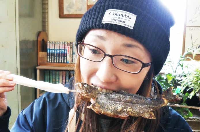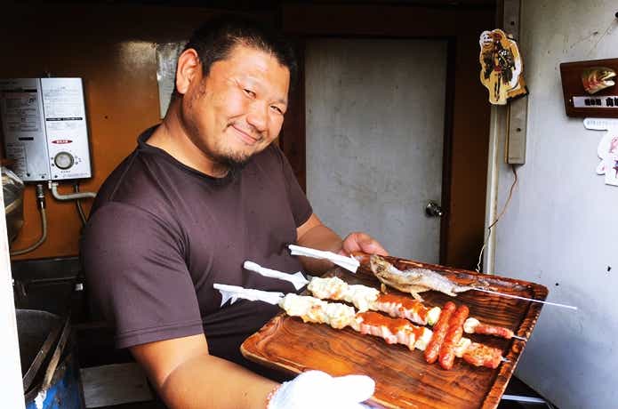 ゲストハウス前の小屋ではスタッフの山ちゃんこと山崎さんが、釣った魚を串焼きにしてくれます。