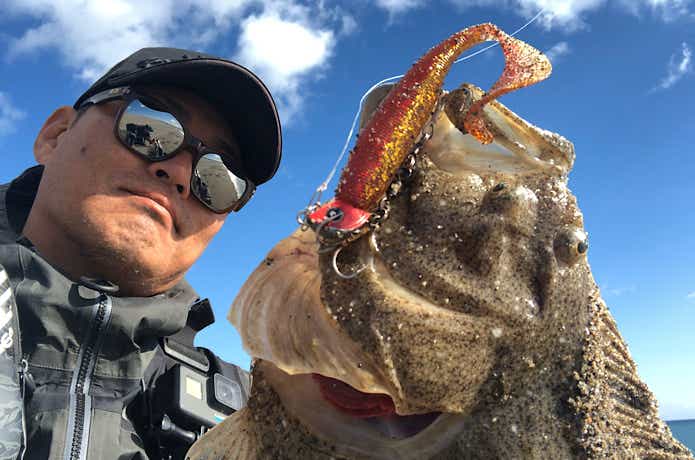 ヒットルアーはフラッグシャッド5インチ。極力スローに巻いてしっかりルアーを見せることで、ドスっと良いバイトが出ました。