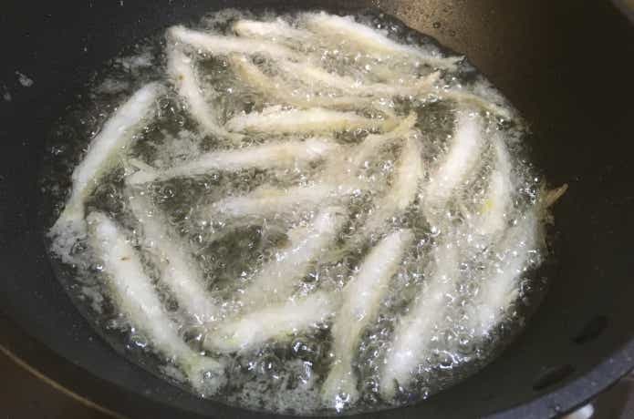 小ぶりのワカサギをまずはフライパンで軽く焼きます。表面に軽く火が通るくらいでOK。