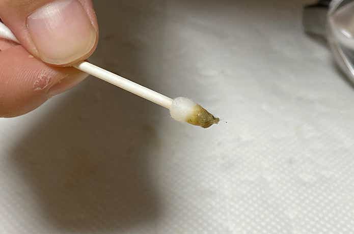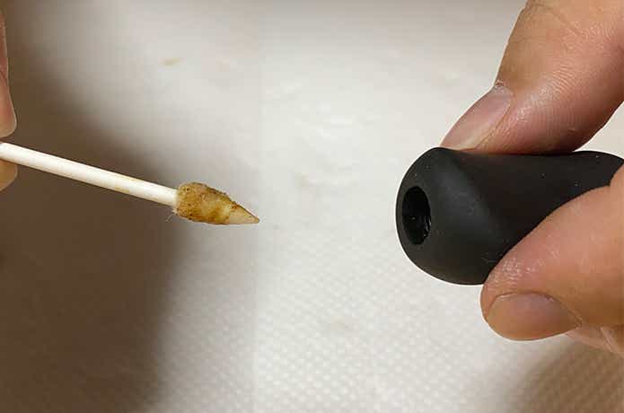 取り外したノブは、内部を綿棒で掃除しましょう。内部を洗浄すると、ご覧のような赤茶けた錆のような汚れが……。