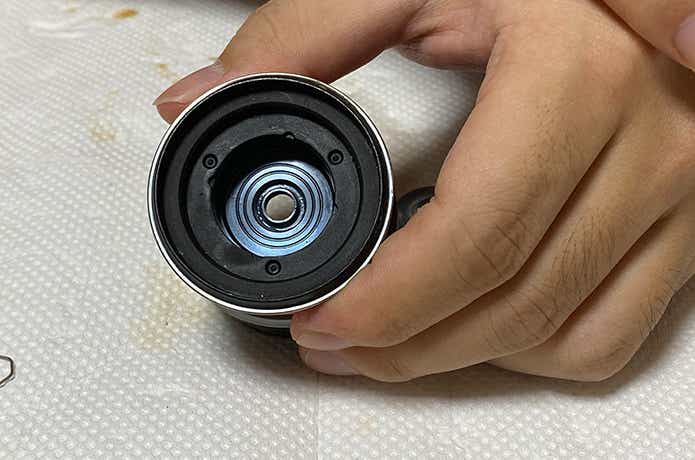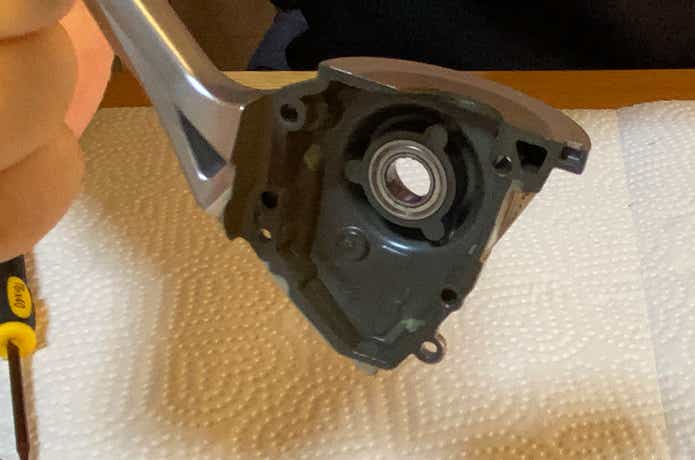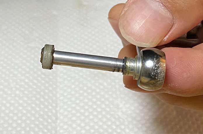 写真のような状態の場合、恐らくベアリング自体にダメージが及んでいるので、今回はベアリングを交換しました。