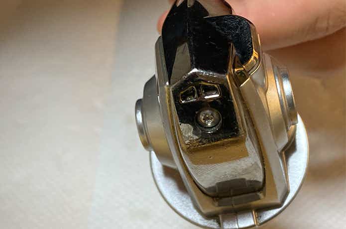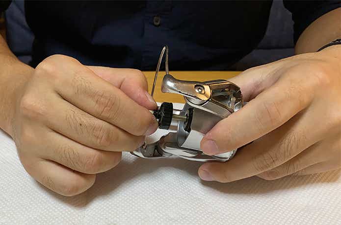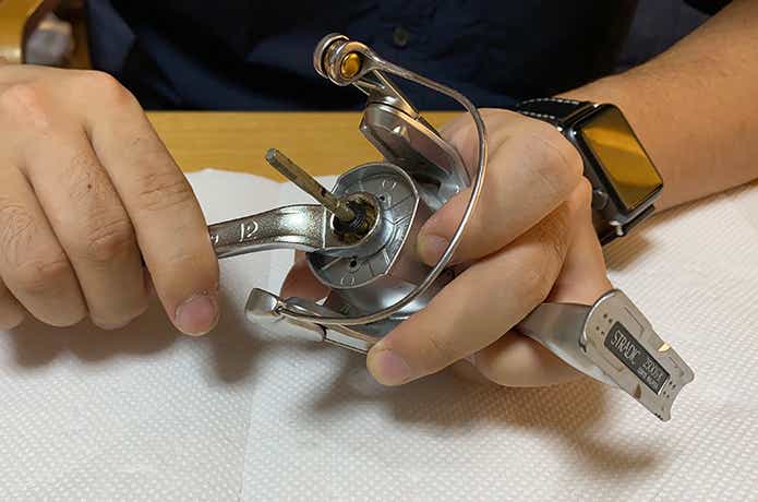 ハンドルキャップを外すには、リールに付属している針金のような工具が便利です。