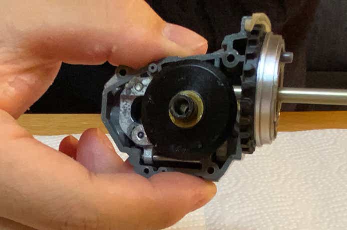 グリスが劣化して黒くなっていることがわかります。ピニオンギアを抜けば、ワンウェイクラッチ周辺のパートは終了です。