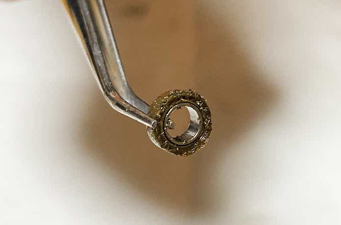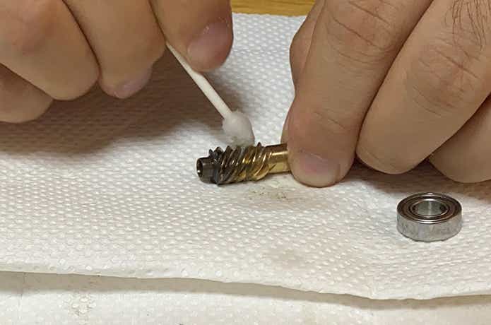 瓶から引き上げたピニオンギア・ドライブギアは、綿棒を使って歯面のグリスをしっかりと取り除きます。