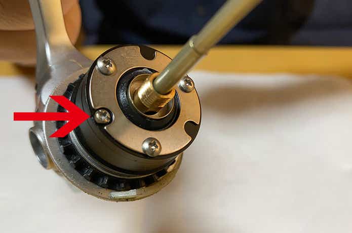 ワンウェイクラッチ本体を固定するネジ(赤矢印)もあるので、こちらは外さないように注意してください。