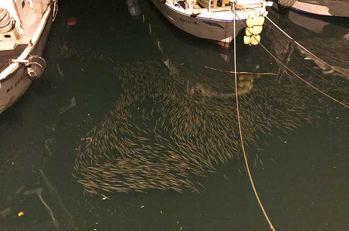 外洋側が荒れている時に内湾に避難してきていたり、夜の街灯に餌を求めて集まってきています。
