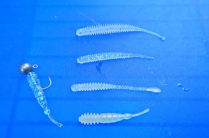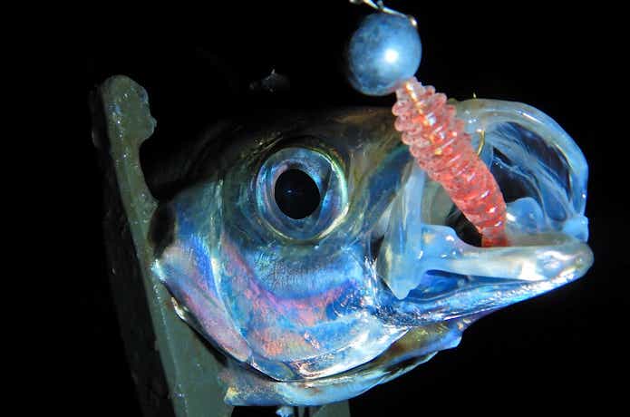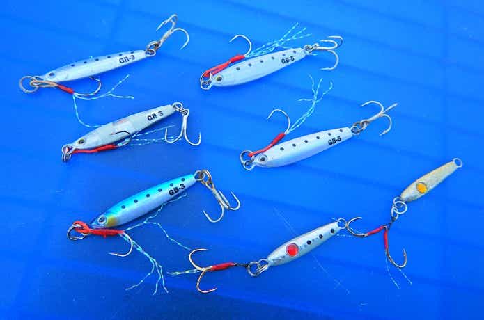潮流の速さに合わせて5〜10グラム程度のシンカーを使い分け、これに0.2〜0.4グラムのジグヘッドを合わせます。