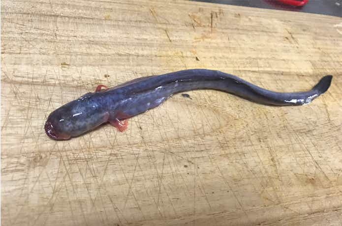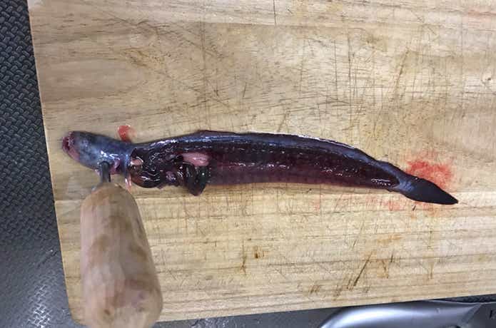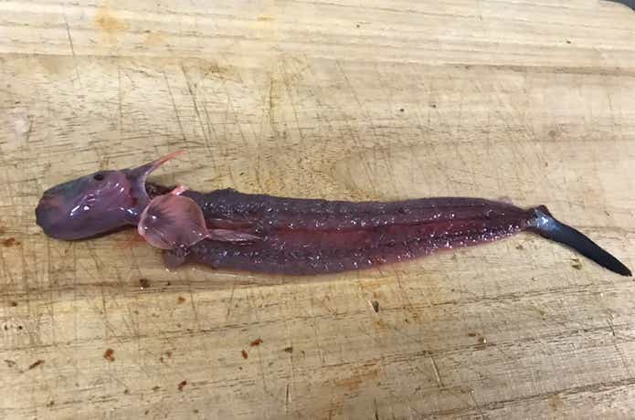 最大全長は40センチ。見た目はインパクト大! 細長い体に鋭い牙、退化した目を持っており、別名エイリアンと呼ばれています。