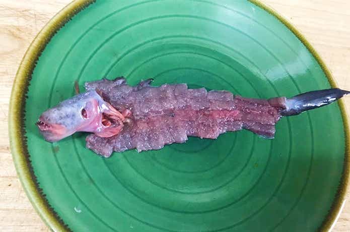 うなぎみたいに目打ちをして捌きます。目が小さすぎて目打ちになってるかは微妙ですね(笑)