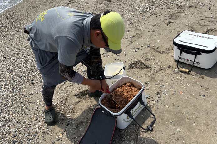 底を狙うためには、比重の高いエサでしっかり海底まで撒き餌を沈めることが重要です。